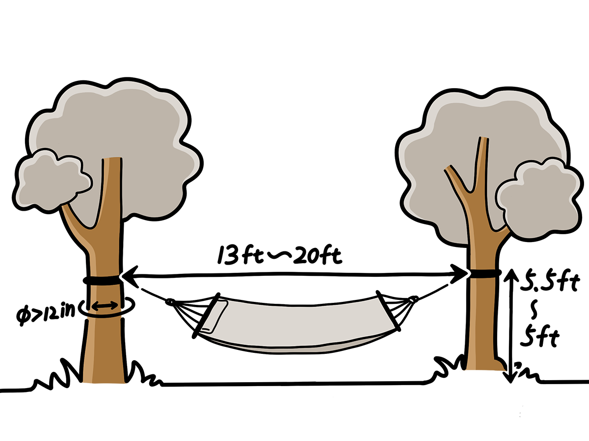This hammock fits 13ft or 15ft hammock stand. If you hang the hammock between two trees, the distance between two trees is not less than 13ft.