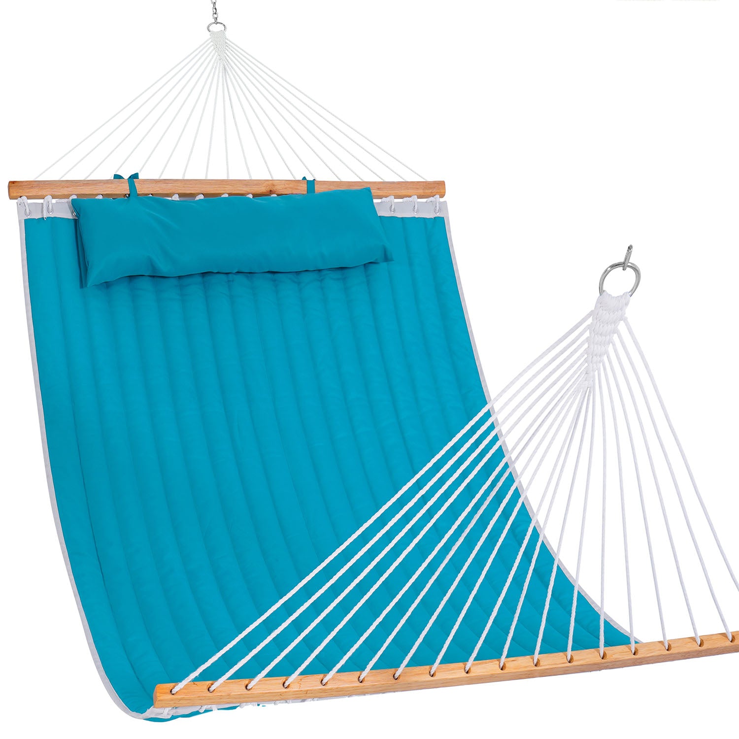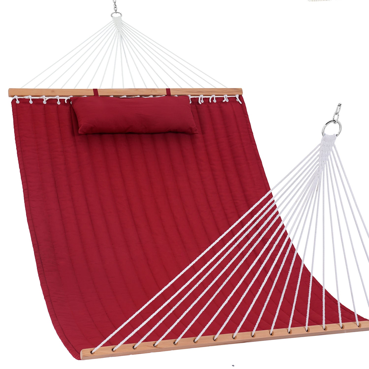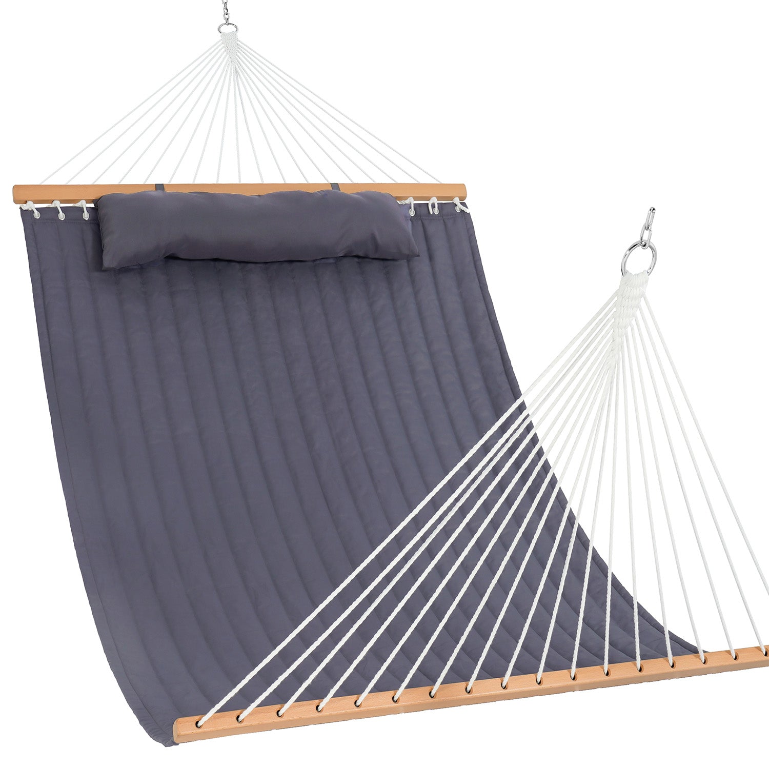 A solid hardwood spreader bar keeps the Double Quilted Hammock open, balanced, and easy to use.