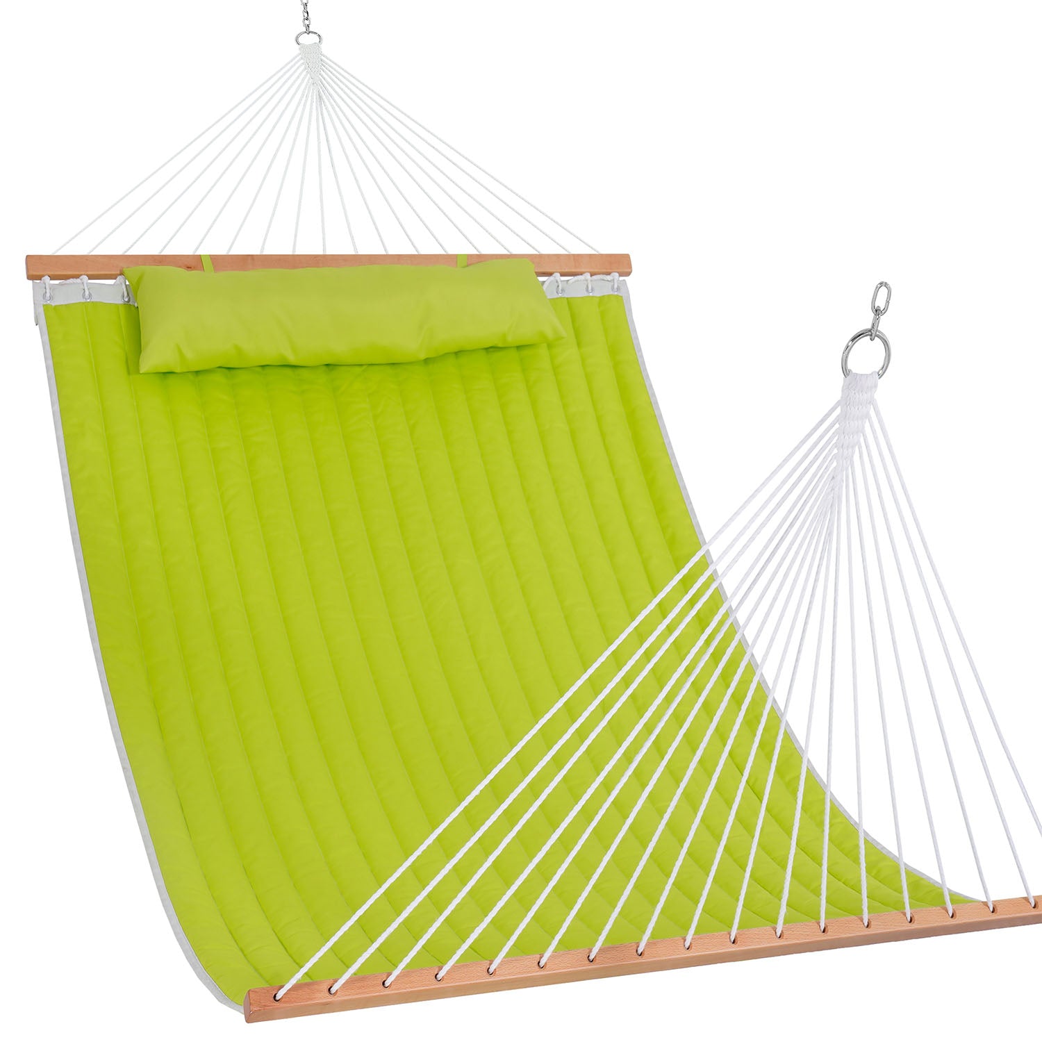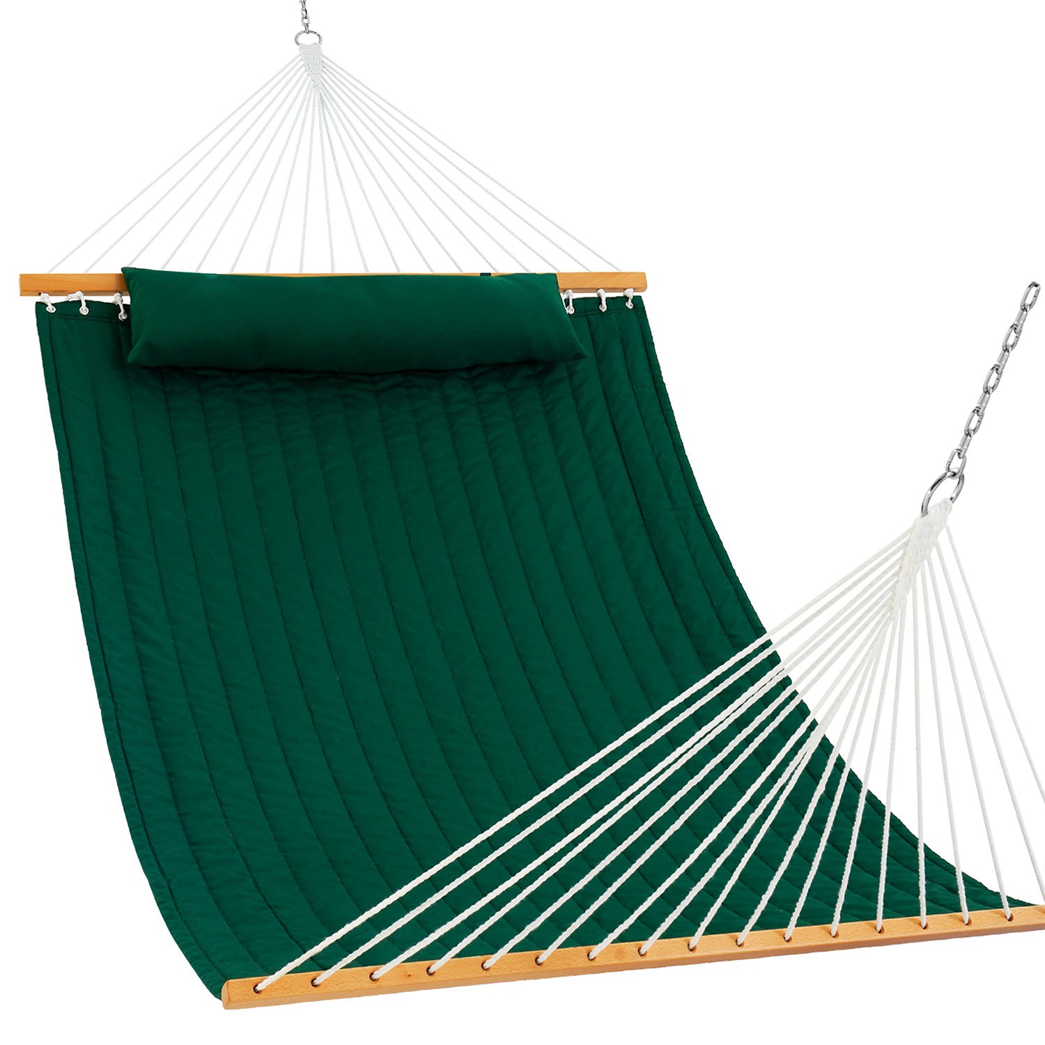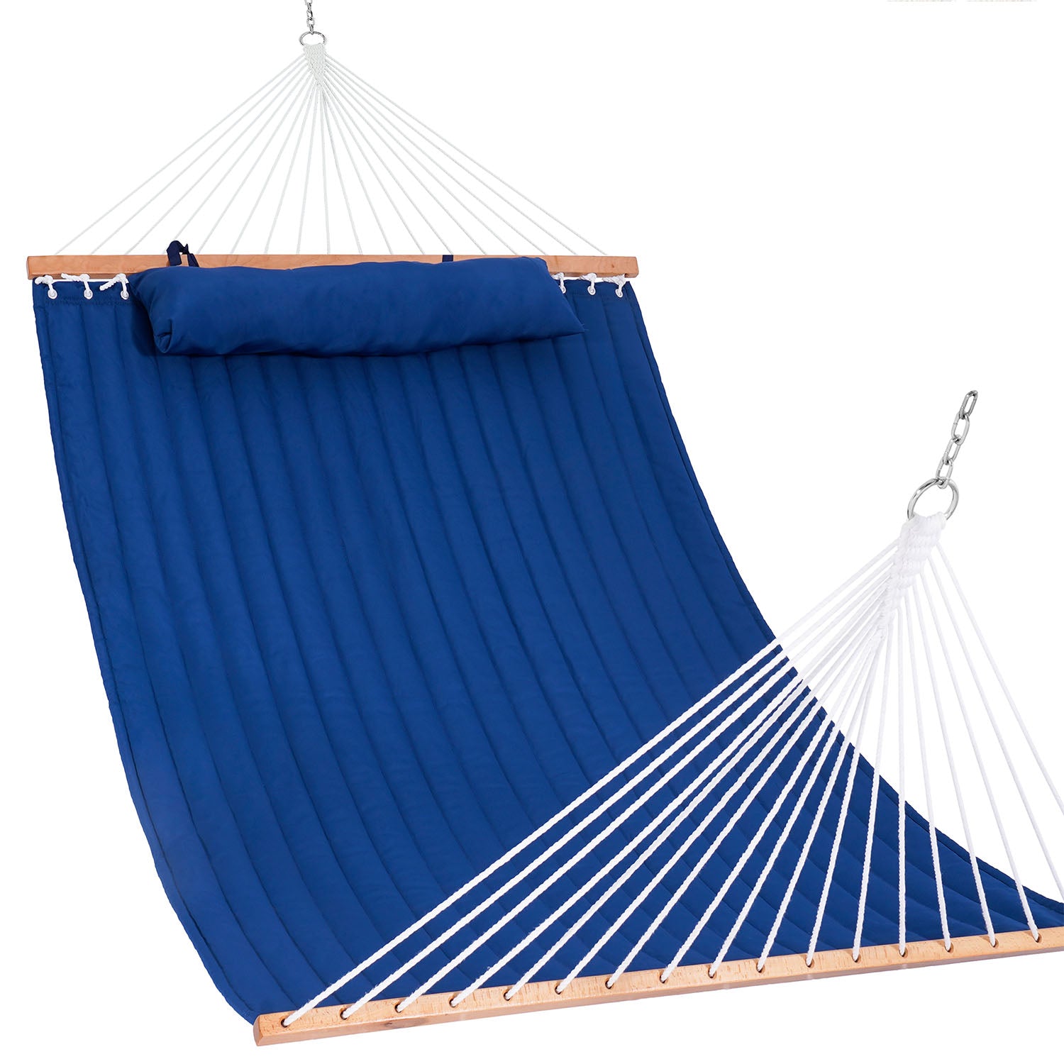 A solid hardwood spreader bar keeps the Double Quilted Hammock open, balanced, and easy to use.